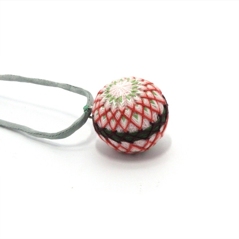 伝統工芸 手作り かがり手まり 【ネックレス】 縁起物 多面十六菊紋 白と鶸萌黄と赤のグラデーション