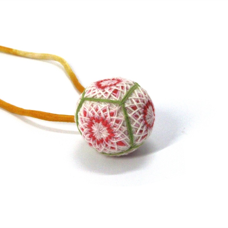 トップ > 伝統工芸 > かがり手まり > 伝統工芸 手作り かがり手まり 【ネックレス】 縁起物 多面十六菊紋 白と鶸萌黄と赤のグラデーション