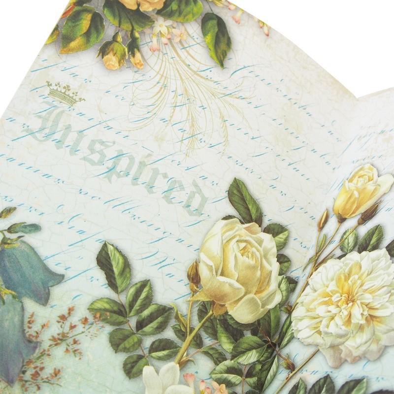 アンティークな色合いで、青い鳥と大きなダリアの花のイラストがプリントされています。